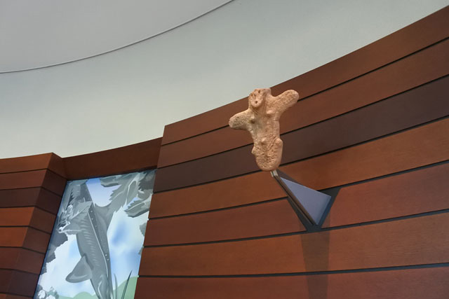 ミュージアムの地下に研究室や作業室みたいなのがあって、収蔵庫もある。その地下へ行く階段の壁が「縄文ビッグウォール」になってるのだった。